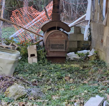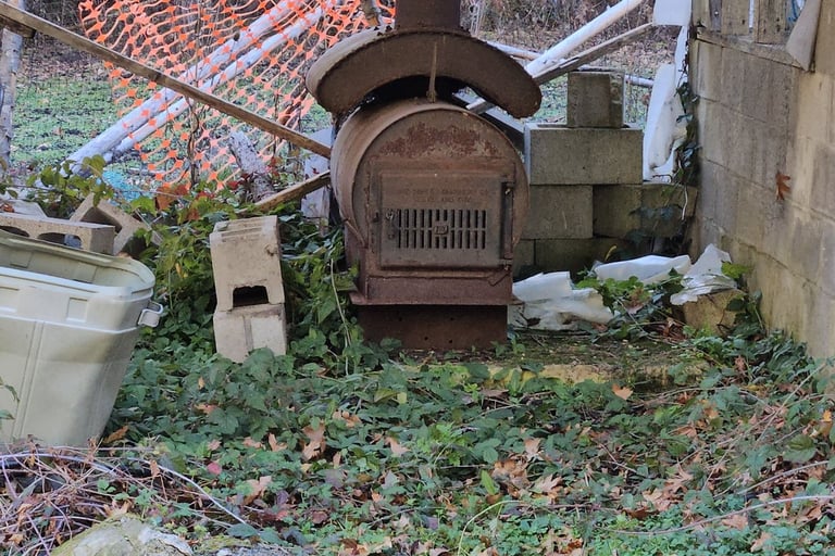 Old-style oven next to our large greenhouse—greenhouse needs some tendering care.