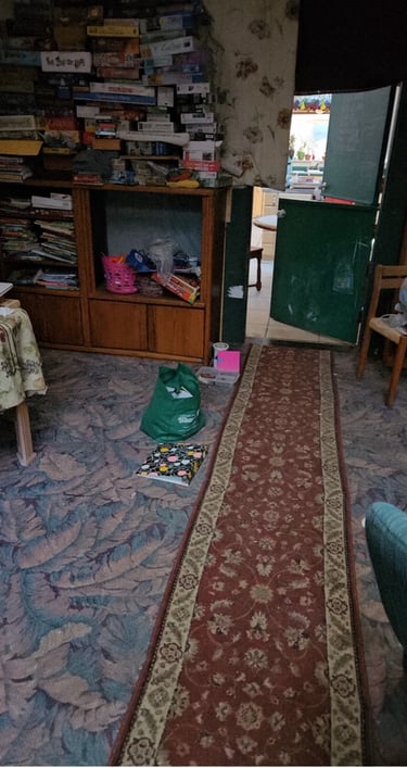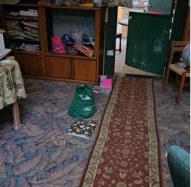 The library itself is disorganized and requires improved lighting. Installing appropriate bookcases, organizing the books, and removing old or broken furniture would help restore the library to a functional and usable condition.